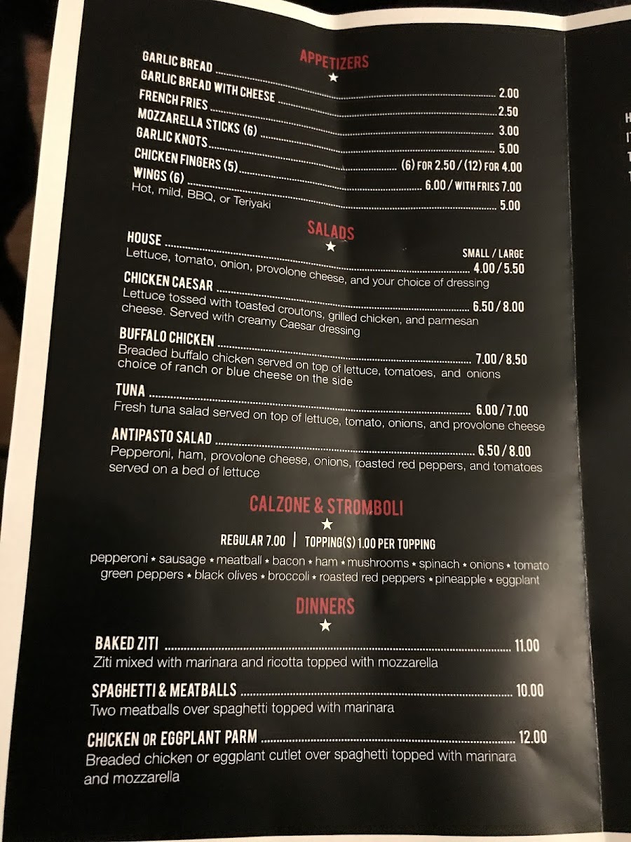 1 large plain pizza, garlic bread, mozzarella sticks and house salad (your choice of dressing) or Caesar Salad.
